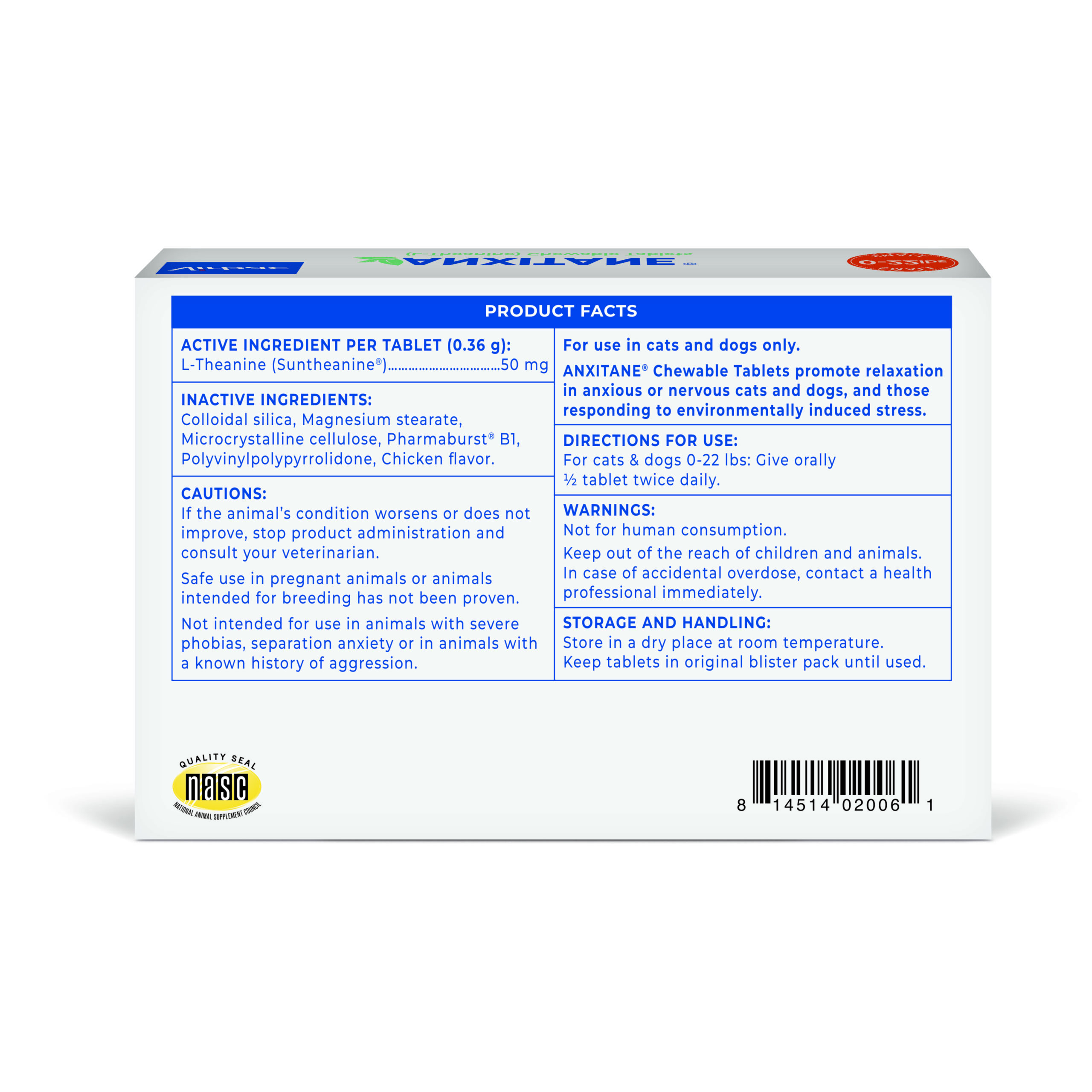 ANXITANE Tablets promote relaxation in dogs and cats that are exhibiting nervousness, environmentally induced stress and or are anxious. It is not intended for use in animals with severe phobias, separation anxiety, or in animals with a known history of aggression.