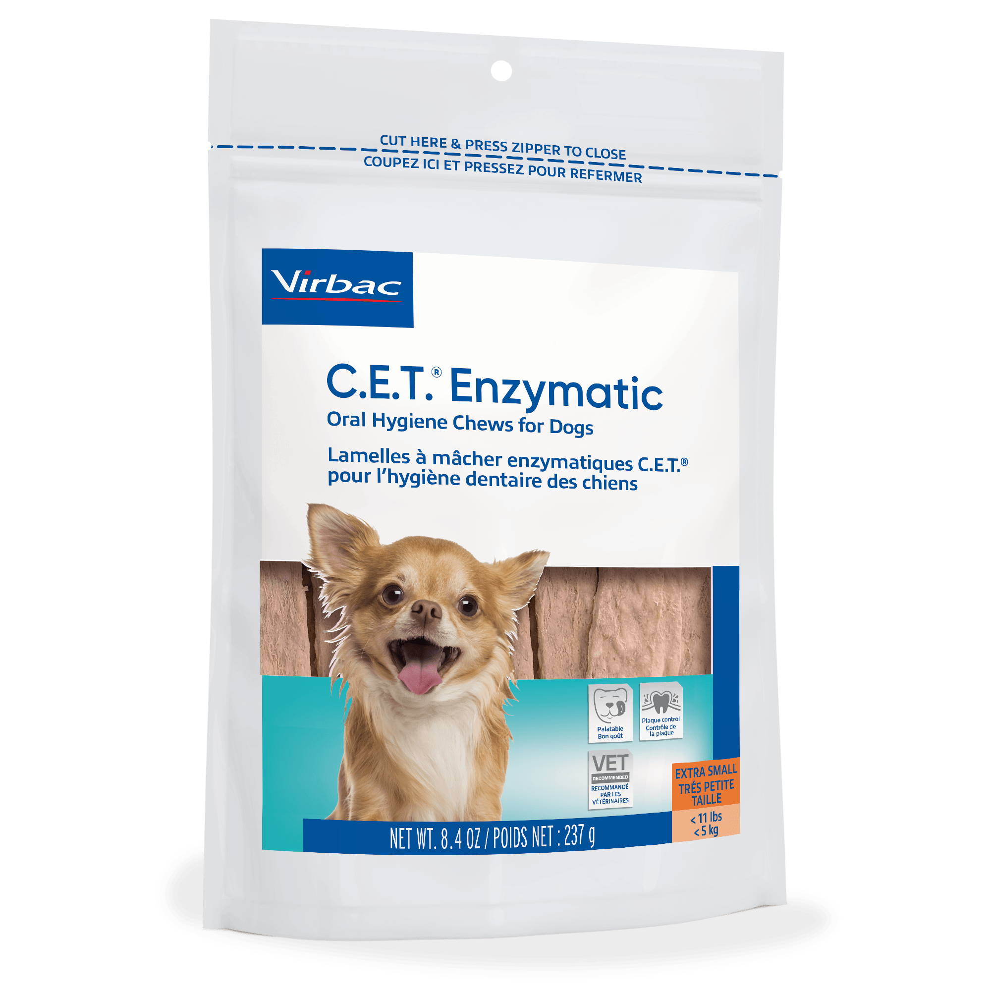 C.E.T. Enzymatic Oral Hygiene Chews feature an exclusive Dual-Enzyme System, plus a coarse texture that works with the dog’s chewing action to reduce plaque and calculus. C.E.T. HEXTRA Premium Chews are made using the unique and proprietary binding-releasing system to ensure maximal release of chlorhexidine, which helps reduce plaque and calculus. Activity resulting from chlorhexidine release may be evident for up to 24 hours.1,2