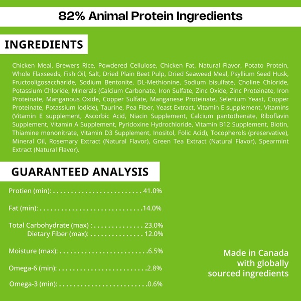 Chicken Meal, Chicken By-Product Meal, Dried Potato Starch, Chicken Fat (preserved with mixed tocopherols), Natural Flavors, Pea Fiber, Brewers Rice, Powdered Cellulose, Dried Peas, Fish Oil (preserved with mixed tocopherols), Whole Flaxseeds, Potassium Chloride, Dried Plain Beet Pulp, Psyllium Seed Husk, Montmorillonite Clays, Fructooligosaccharide, Salt, Sodium Bisulfate, Calcium Sulfate, DL-Methionine, Vitamins (Vitamin A Supplement, Vitamin D3 Supplement, Vitamin E Supplement, Niacin Supplement, Calcium Pantothenate, Thiamine Mononitrate, Pyridoxine Hydrochloride, Riboflavin Supplement, Folic Acid, Biotin, Vitamin B12 Supplement), Minerals (Zinc Sulfate, Ferrous Sulfate, Zinc Proteinate, Iron Proteinate, Zinc Oxide, Copper Sulfate, Copper Proteinate, Manganese Sulfate, Manganese Proteinate, Calcium Iodate, Sodium Selenite), Choline Chloride, Yeast Extract, Taurine, Propyl Gallate (preservative), Citric Acid (preservative), Rosemary Extract.