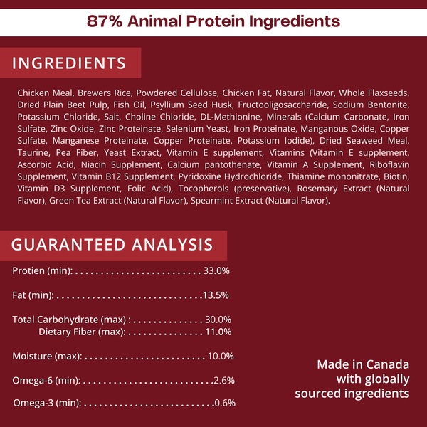 Chicken Meal, Brewers Rice, Powdered Cellulose, Chicken Fat, Natural Flavor, Whole Flaxseeds, Dried Plain Beet Pulp, Fish Oil, Psyllium Seed Husk, Fructooligosaccharide, Sodium Bentonite, Potassium Chloride, Salt, Choline Chloride, DL-Methionine, Minerals (Calcium Carbonate, Iron Sulfate, Zinc Oxide, Zinc Proteinate, Selenium Yeast, Iron Proteinate, Manganous Oxide, Copper Sulfate, Manganese Proteinate, Copper Proteinate, Potassium Iodide), Dried Seaweed Meal, Taurine, Pea Fiber, Yeast Extract, Vitamin E supplement, Vitamins (Vitamin E supplement, Ascorbic Acid, Niacin Supplement, Calcium pantothenate, Vitamin A Supplement, Riboflavin Supplement, Vitamin B12 Supplement, Pyridoxine Hydrochloride, Thiamine mononitrate, Biotin, Vitamin D3 Supplement, Folic Acid), Tocopherols (preservative), Rosemary Extract (Natural Flavor), Green Tea Extract (Natural Flavor), Spearmint Extract (Natural Flavor).