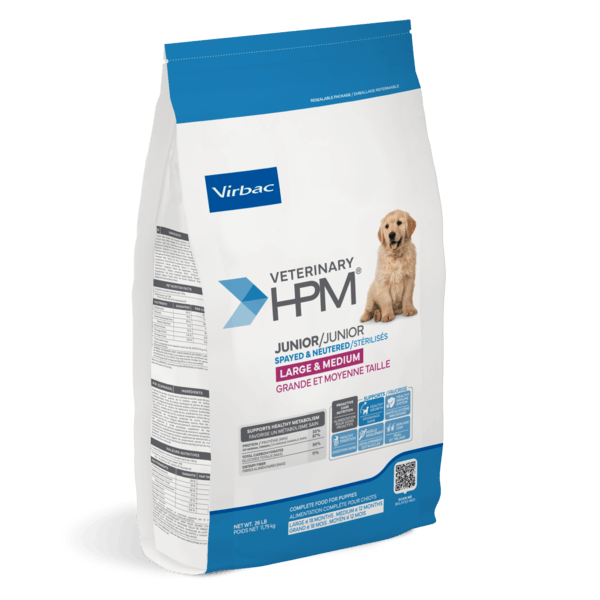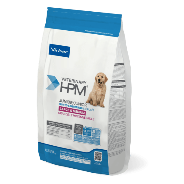 VETERINARY HPM® Junior Spayed & Neutered Large & Medium Dog Food is designed for proactive weight management, combining high protein (33% protein content) and fiber to support fullness and optimal weight. With 87% animal-sourced protein, this diet promotes lean muscle development and a healthy metabolism. A precise blend of protein, carbohydrates, and fibers works alongside prebiotics to support healthy digestion. While especially beneficial after a spay or neuter procedure, when metabolism slows and appetite often increases, this diet also supports the overall well-being of sedentary or less active pets.