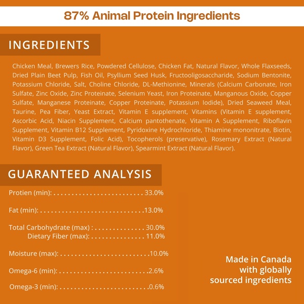 Chicken Meal, Brewers Rice, Powdered Cellulose, Chicken Fat, Natural Flavor, Whole Flaxseeds, Dried Plain Beet Pulp, Fish Oil, Psyllium Seed Husk, Fructooligosaccharide, Sodium Bentonite, Potassium Chloride, Salt, Choline Chloride, DL-Methionine, Minerals (Calcium Carbonate, Iron Sulfate, Zinc Oxide, Zinc Proteinate, Selenium Yeast, Iron Proteinate, Manganous Oxide, Copper Sulfate, Manganese Proteinate, Copper Proteinate, Potassium Iodide), Dried Seaweed Meal, Taurine, Pea Fiber, Yeast Extract, Vitamin E supplement, Vitamins (Vitamin E supplement, Ascorbic Acid, Niacin Supplement, Calcium pantothenate, Vitamin A Supplement, Riboflavin Supplement, Vitamin B12 Supplement, Pyridoxine Hydrochloride, Thiamine mononitrate, Biotin, Vitamin D3 Supplement, Folic Acid), Tocopherols (preservative), Rosemary Extract (Natural Flavor), Green Tea Extract (Natural Flavor), Spearmint Extract (Natural Flavor).