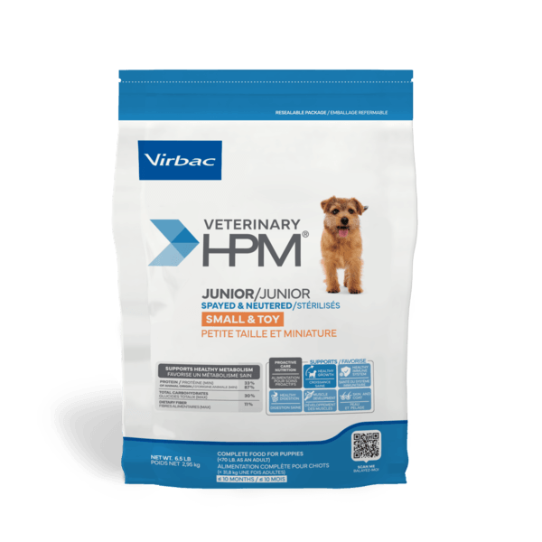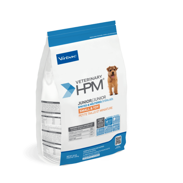 VETERINARY HPM® Junior Spayed & Neutered Small & Toy Dog Food is designed for proactive weight management, combining high protein (33% protein content) and fiber to support fullness and optimal weight. With 87% animal-sourced protein, this diet promotes lean muscle development and a healthy metabolism. A precise blend of protein, carbohydrates, and fibers works alongside prebiotics to support healthy digestion. While especially beneficial after a spay or neuter procedure, when metabolism slows and appetite often increases, this diet also supports the overall well-being of sedentary or less active pets.